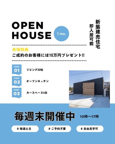 八代市千丁町オープンハウス開催! 八代市千丁町の建売住宅が完成いたしまして、オープンハウスを開催しております! 閑静な住宅地にある平屋のお家です。 LDKは20帖☆家計に優しいオール電化仕様となっております。照明やTVアンテナ、網戸、ウッドデッキも標準装備となっておりますので、費用を抑えることができますよ🤗 更にご成約のお客様には10万円プレゼント🎉詳細等はお気軽にお問い合わせください。 2026/01/16 10:20お知らせ Tweet